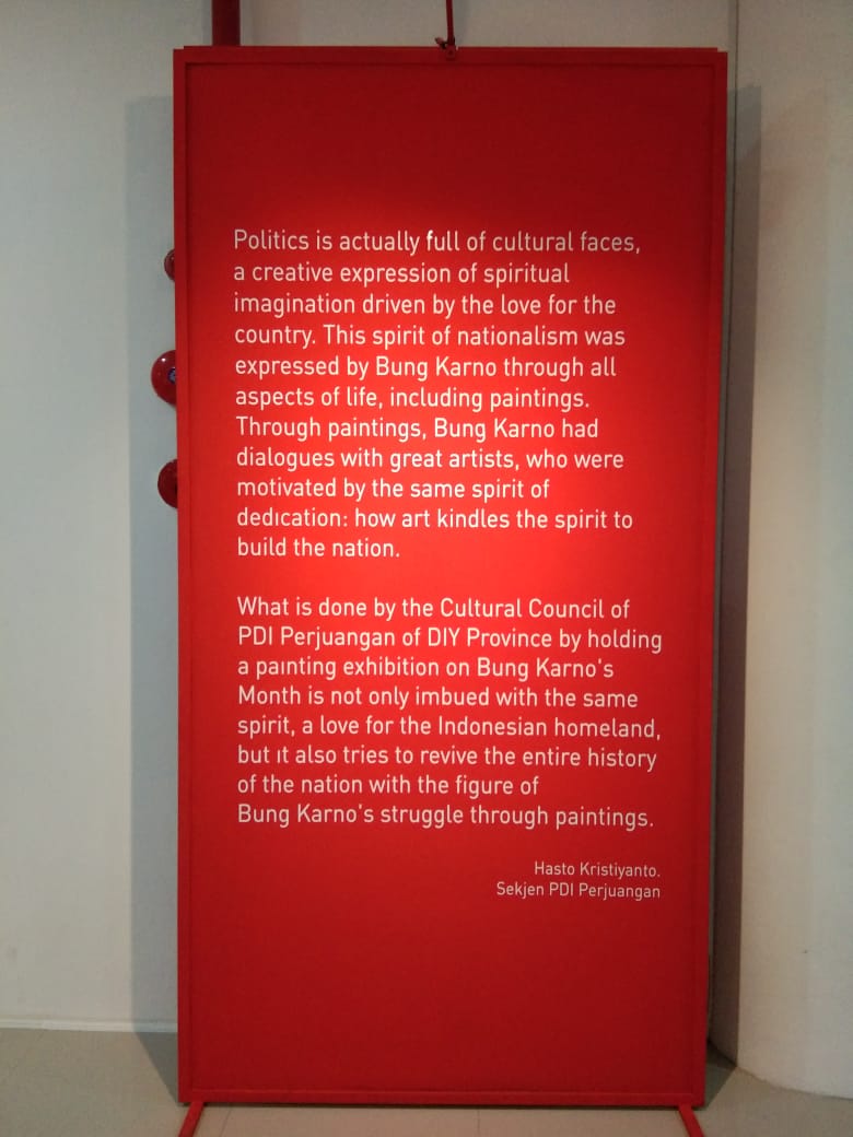 Totok Hedi selaku ketua penyelenggara menyatakan, peringatan Bulan Bung Karno menjadi memori untuk selalu kita ingat ajaran nya bahwa bangsa kita harus berdaulat secara politik, berdikari secara ekonomi dan berkepribadian dalam kebudayaan. Yogyakarta memiliki kenangan sangat melekat dengan upaya Bung Karno memperjuangkan dan mempertahankan kemerdekaan. Kini Yogyakarta telah tumbuh menjadi bagian penting dari Indonesia dan menjadi kota yang berkepribadian dalam kebudayaan dan kesenian. Kantor PDI Perjuangan ini dibangun bukan sekedar kantor administrasi tapi sekaligus sebagai rumah rakyat dan rumah budaya, tempat bagi para seni rupawan memamerkan karyanya, demikian Totok Hedi yang juga inisiator acara tersebut.