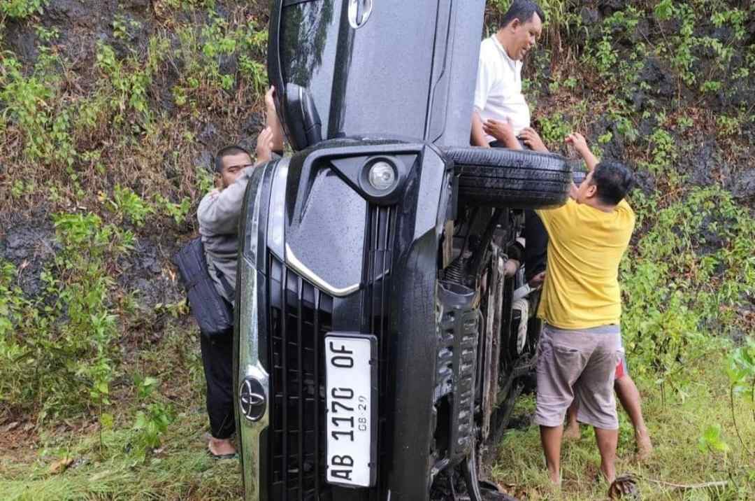 Peristiwa tersebut melibatkan mobil Toyota Avanza berwarna hitam dengan nomor polisi AB 1170 QF yang terguling setelah menabrak tebing di sisi jalan.