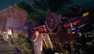 Blitar suryapos.id Sebuah kecelakaan lalu lintas yang melibatkan truck gandeng N 8479 UE bermuatan tebu terjadi di jalan raya Kalilegi Desa Banjarsari Kecamatan Selorejo Kabupaten Blitar, pada Selasa (24/8) malam.
