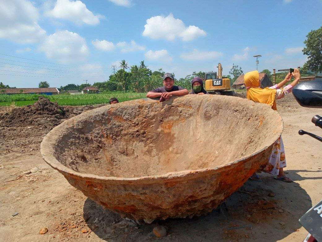 Wajan raksasa yang ditemukan saat penggalian sedalam 3 meter di tanah kas desa yang akan dibuat untuk jalan tembus desa, sedangkan tanah hasil penggalian digunakan untuk menguruk lapangan desa.