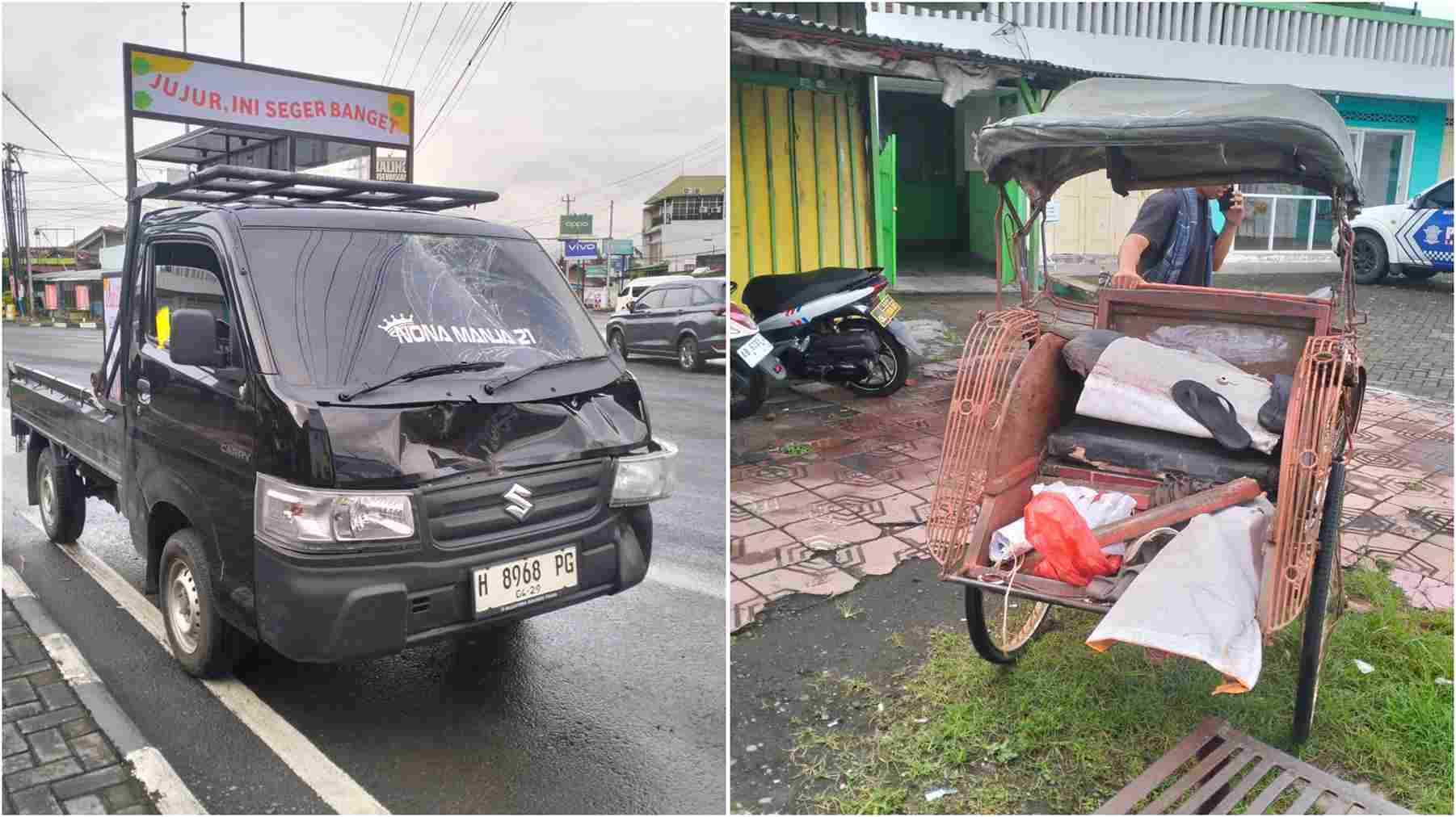 Kendaraan yang terlibat yakni pikap Suzuki bernomor polisi H-8968-PG dengan sebuah becak kayuh. Peristiwa tersebut terjadi saat arus lalu lintas pagi hari mulai padat di kawasan persimpangan.