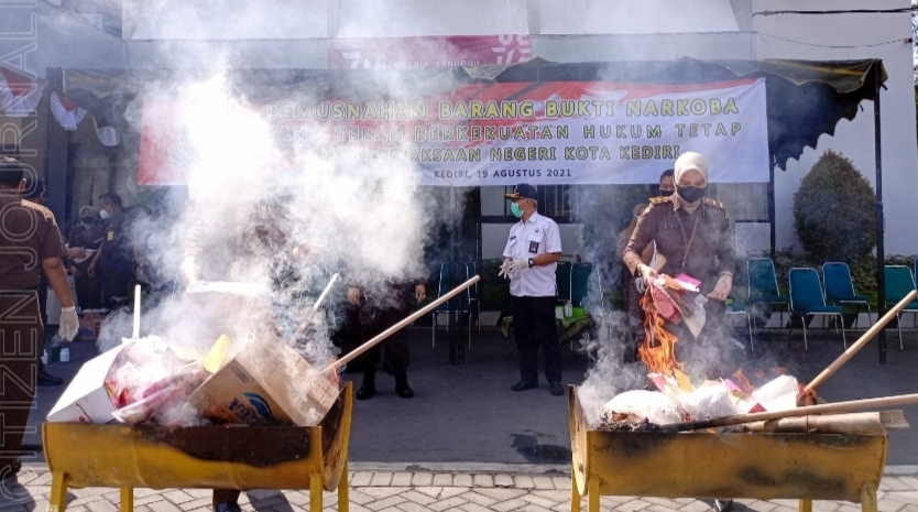 Kediri suryapos.id Kejaksaan Negeri Kediri menggelar pemusnahan barang bukti narkoba yang sudah mempunyai keputusan hukum yang tetap (Inkracht) pada Kamis (19/8) di halaman Kantor Kejaksaan Negeri Kediri.