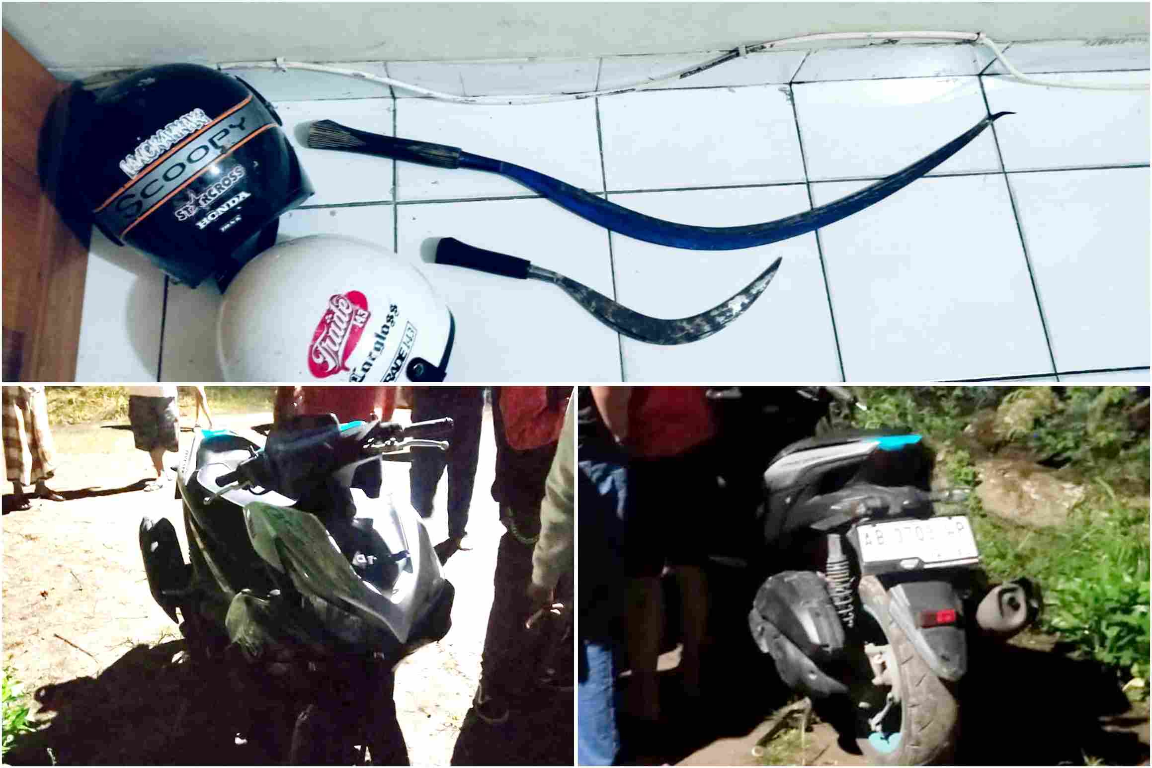 Mereka kemudian mendapati sepeda motor Yamaha Aerox dalam keadaan masih menyala, sementara di dekatnya ditemukan dua buah celurit dan tidak ada orang di sekitar lokasi.