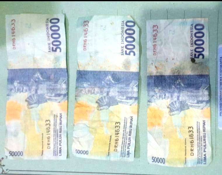Dari hasil pemeriksaan, polisi menemukan tiga lembar uang palsu pecahan Rp 50.000 dengan nomor seri yang sama, serta satu lembar uang asli pecahan Rp 20.000.