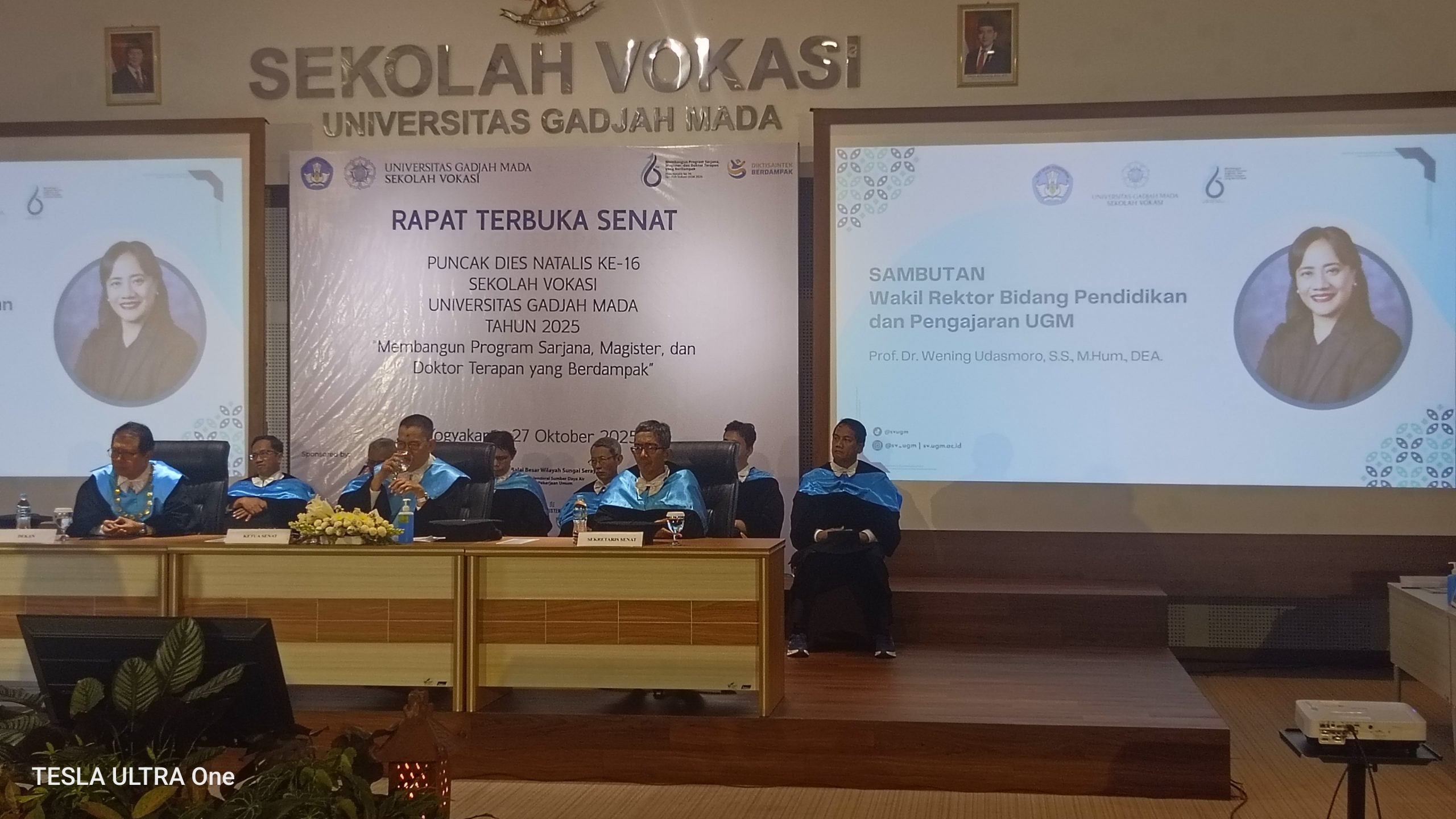 Yogyakarta, (27/10/2025) — Sekolah Vokasi Universitas Gadjah Mada akan menyelenggarakan Rapat Terbuka Senat sebagai puncak dari perayaan Dies Natalis yang ke-16 pada hari Senin, 27 Oktober 2025. Acara tersebut akan dilaksanakan di Ballroom Gedung TILC Sekolah Vokasi UGM, dimulai dari pukul 08.00 hingga 12.00 WIB. Kegiatan tahun ini mengangkat tema “Membangun Program Sarjana, Magister, dan Doktor Terapan yang Berdampak. ”