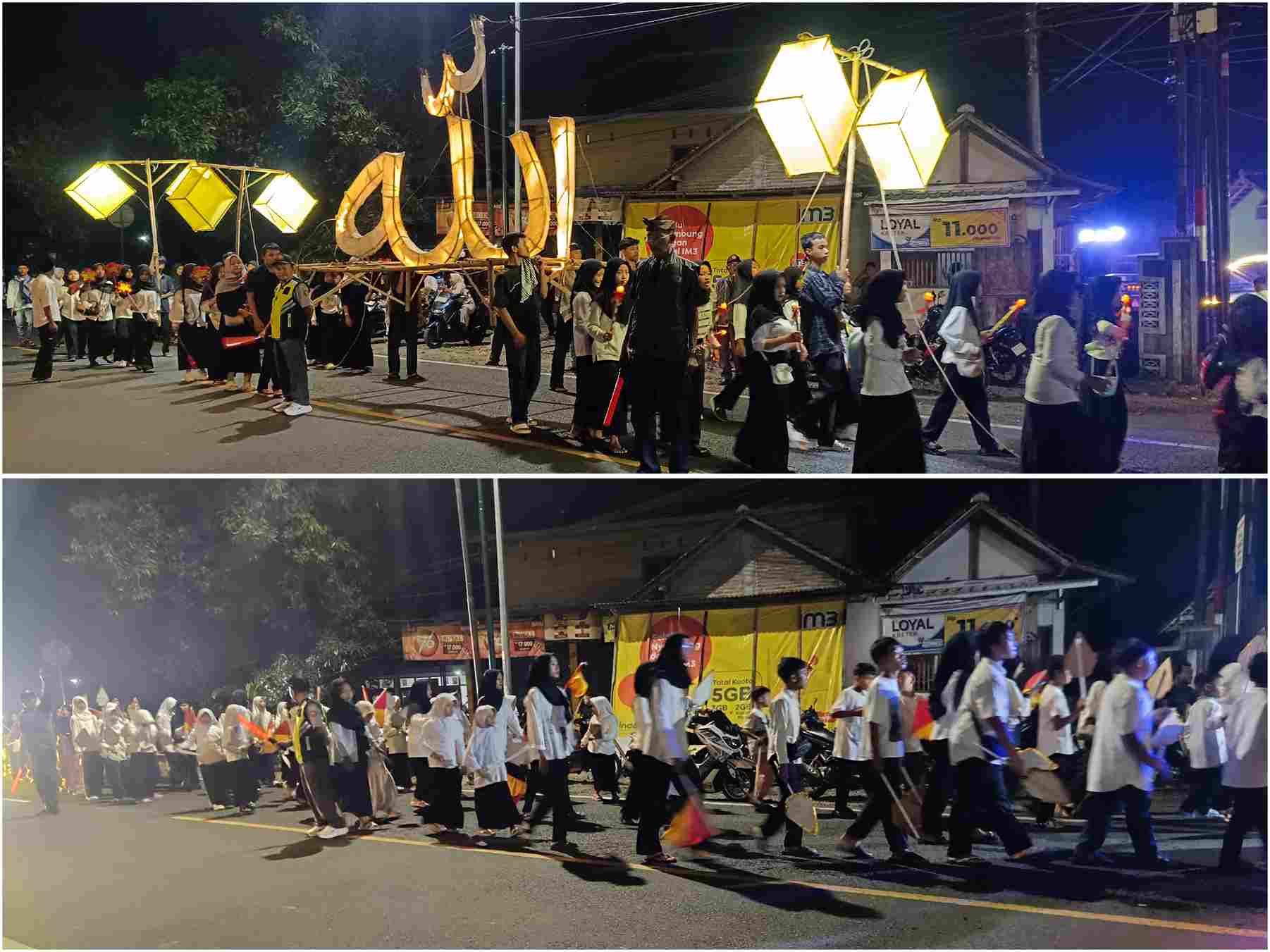 Lantunan takbir, tahmid, dan tahlil menggema sepanjang jalan, menciptakan suasana religius sekaligus mempererat kebersamaan antarwarga. Peserta takbir keliling tampak membawa obor, lampion, serta berbagai atribut bernuansa Islami, menambah semarak perayaan malam kemenangan.