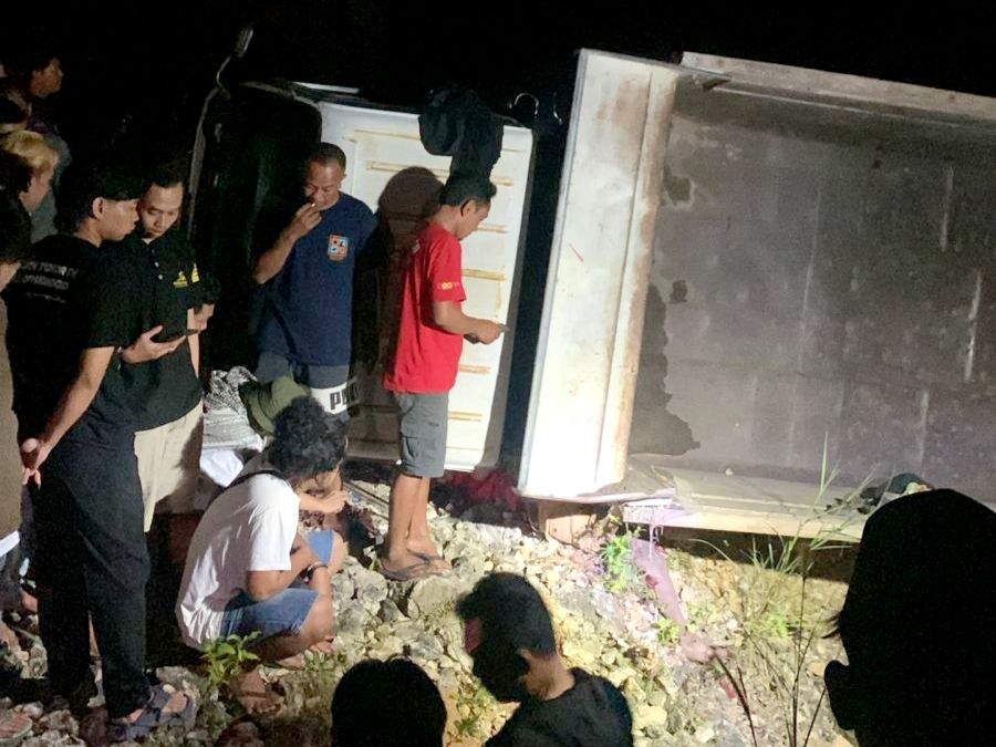 “Dari keterangan pengemudi, kendaraan sempat oleng ke kiri dan ke kanan. Saat dibanting ke kanan, muncul sepeda motor dari arah berlawanan, sehingga pengemudi kembali membanting setir ke kiri. Akibatnya, truk masuk ke parit di pinggir jalan dan terguling,” ujarnya.