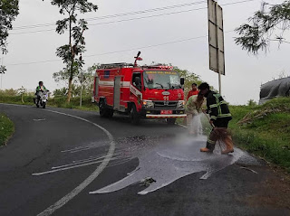 Melihat tumpahan solar yang licin dan bisa membahayakan masyarakat pengguna jalan, segera dilaporkan oleh warga masyarakat pada petugas Damkar Kabupaten Magelang, agar dilakukan penanganan untuk menghindari adanya kecelakaan lalu lintas.